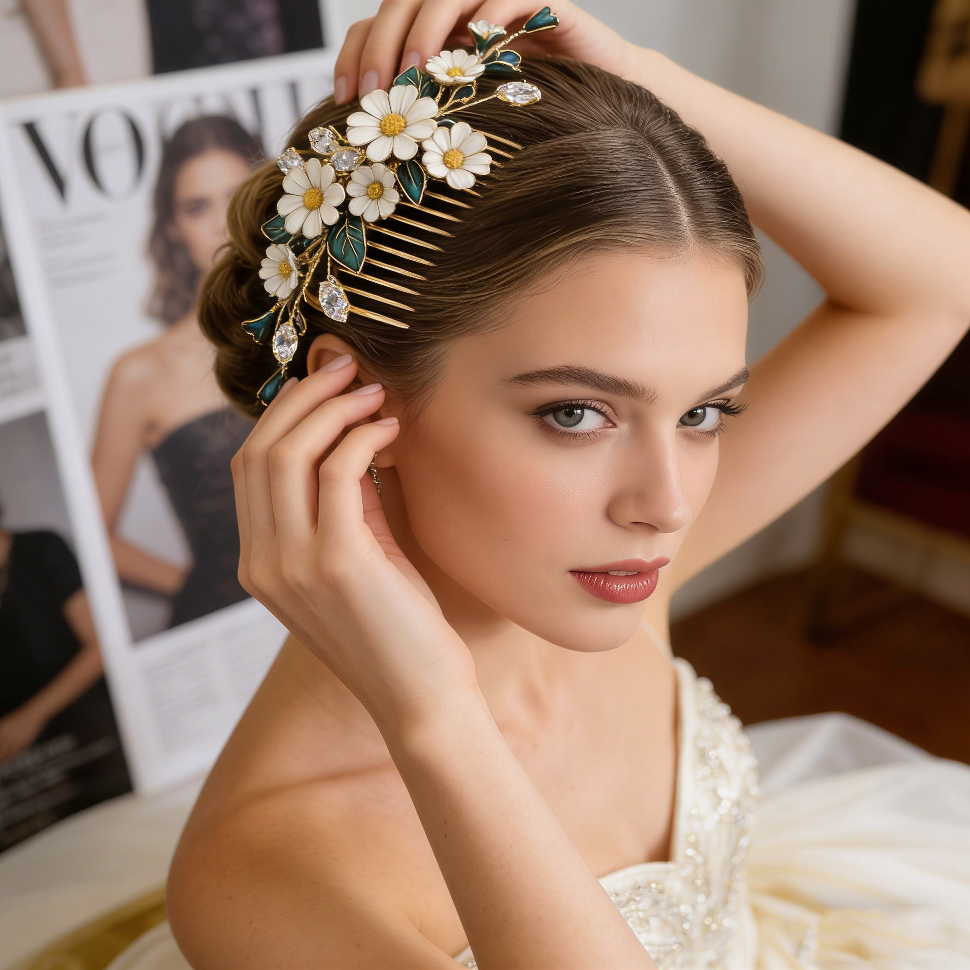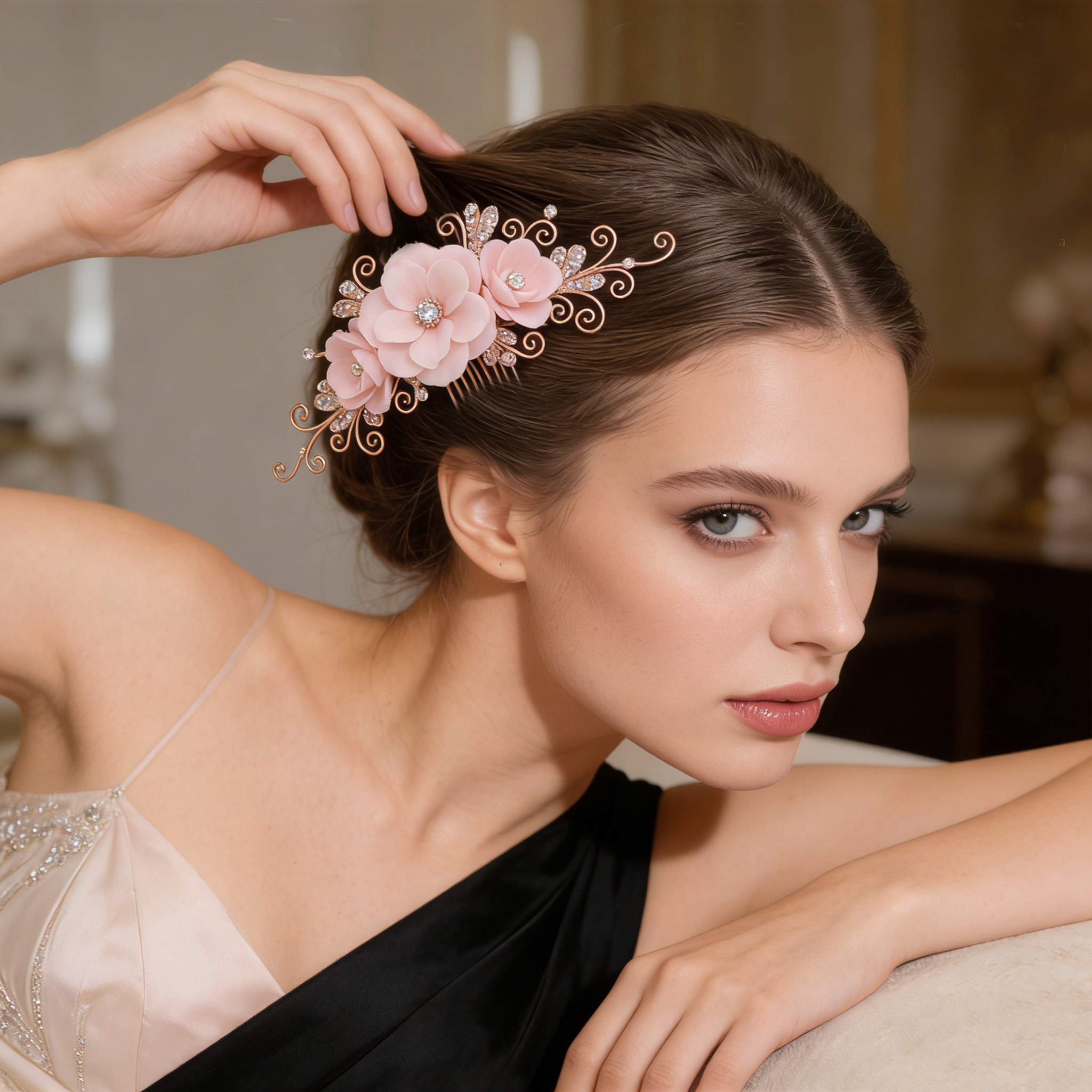 Shop nowAdorned with soft blush pink flowers and rose gold filigree, this tuck comb brings delicate romance to weddings and special events.