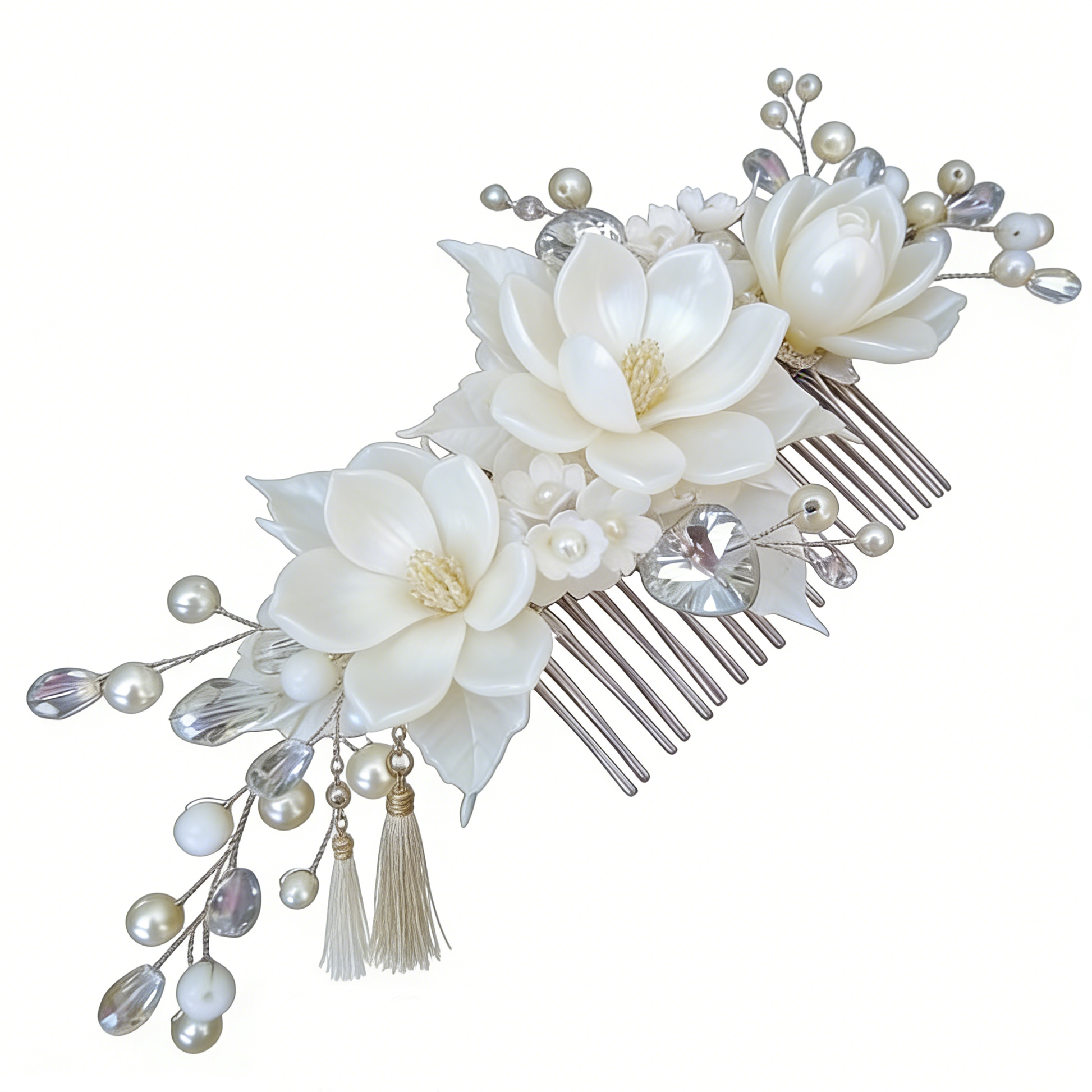 Luxurious white magnolia flowers, ivory pearls, and crystals are finished with soft ivory tassels. Ideal for grand bridal or traditional formal hairstyles.