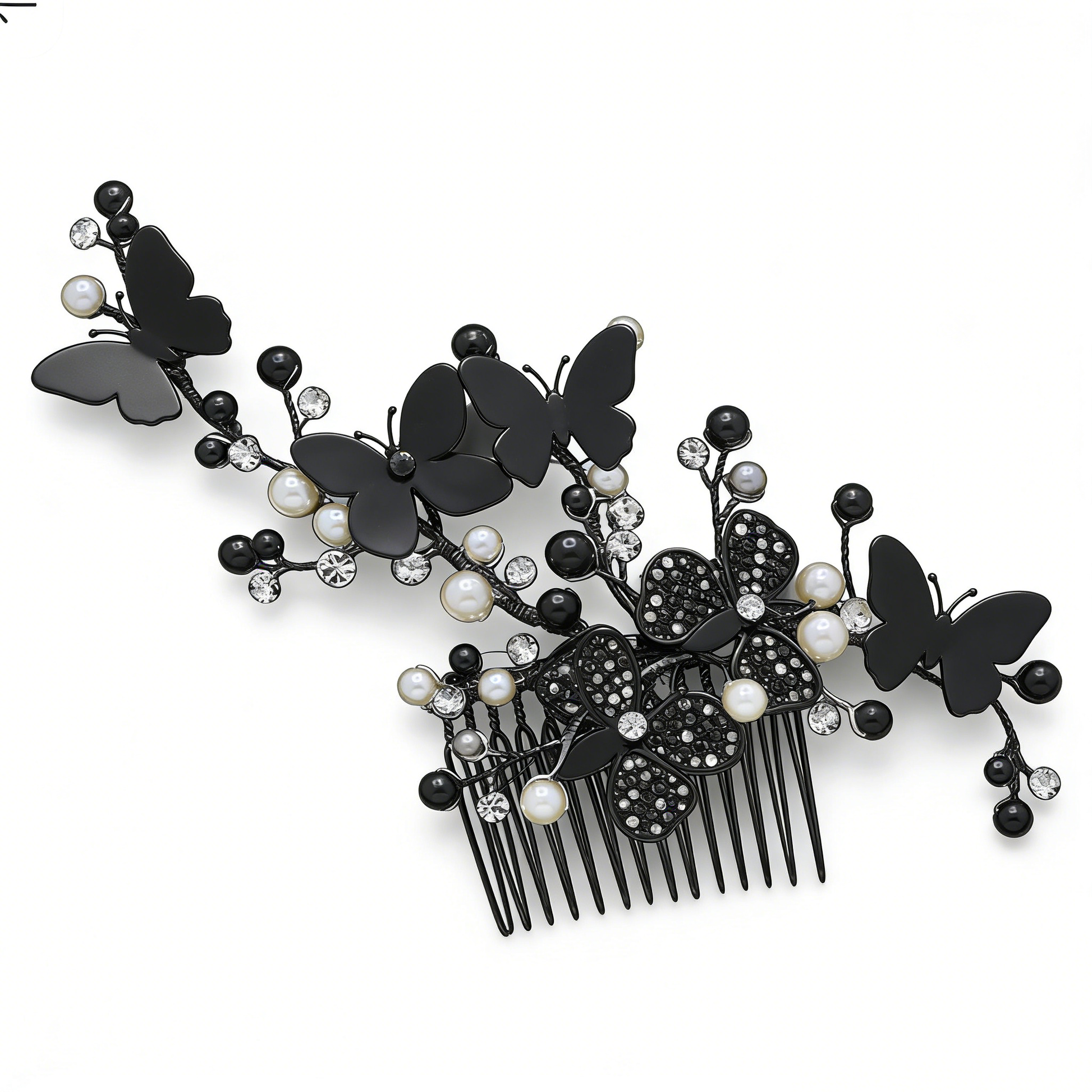 This elegant black butterfly tuck comb features matte black butterflies, lustrous pearls, and sparkling crystals, perfect for gothic or evening hairstyles. Its intricate branch design adds a touch of dark romance to any look.