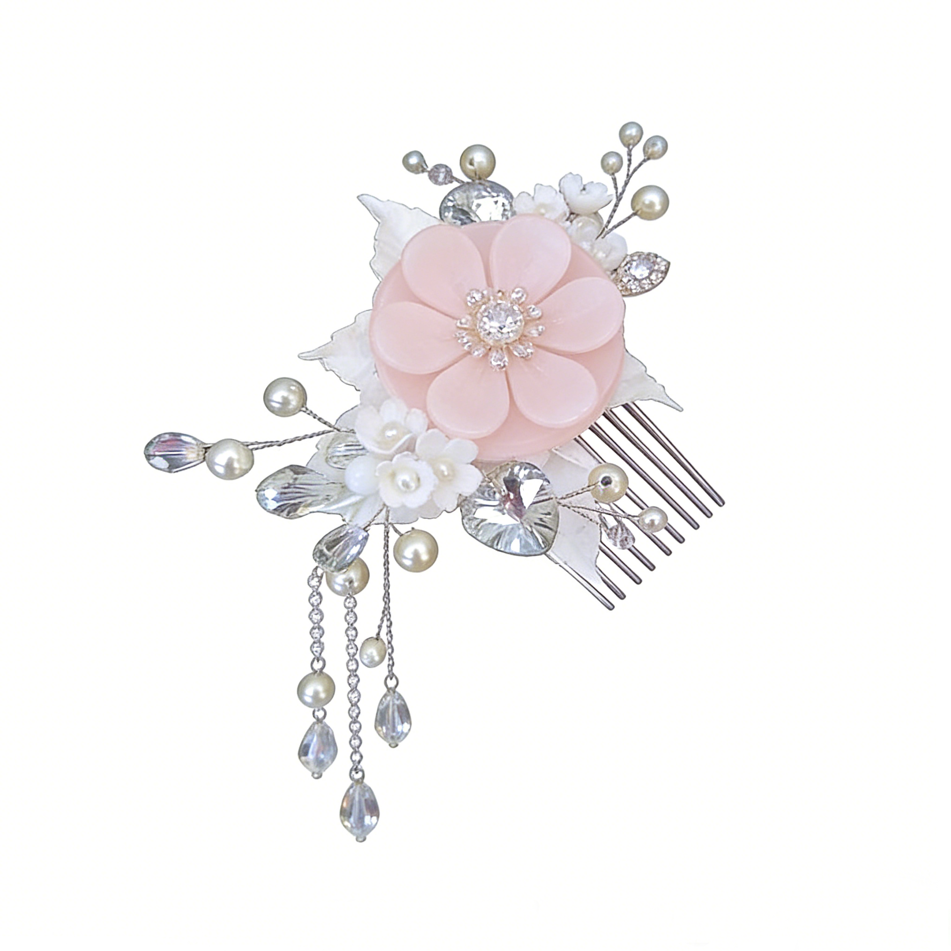 A large pink blossom, ivory pearls, and crystals are paired with dangling pearl chains. Perfect for romantic evening or bridal hairstyles.