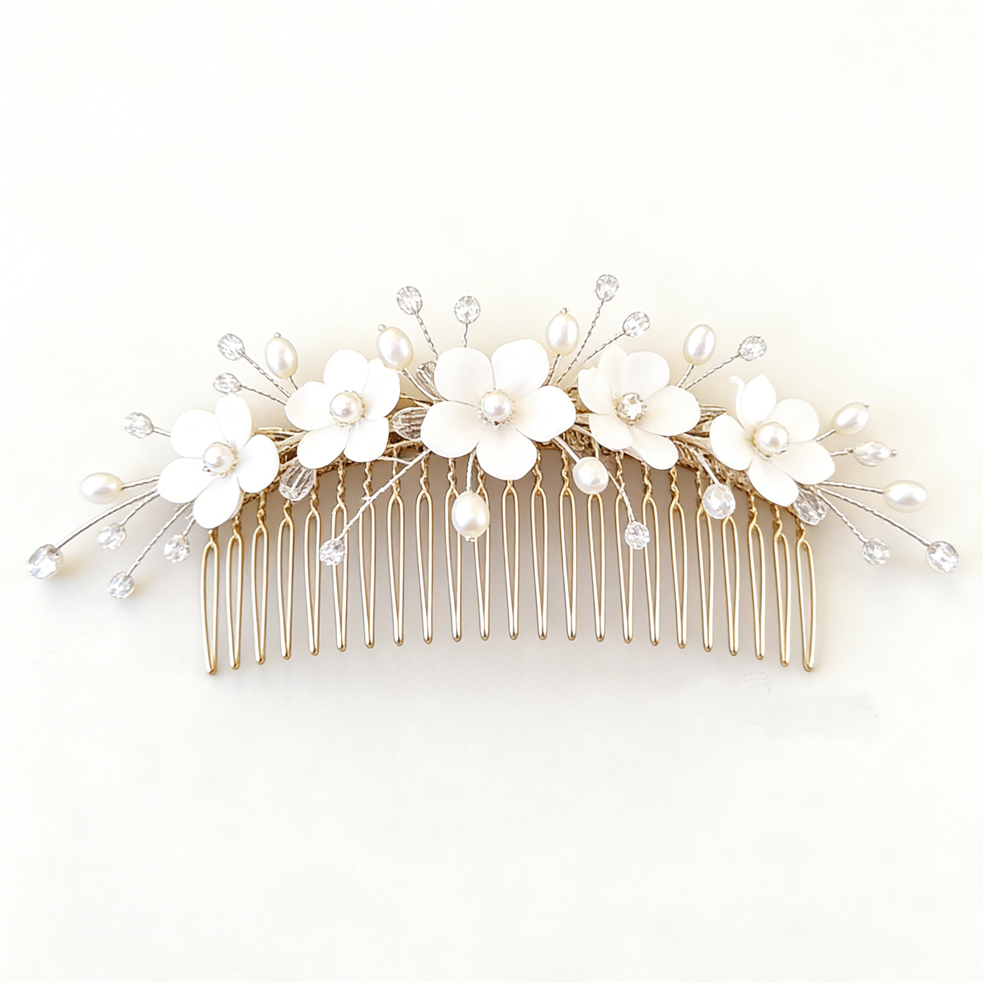Six white daisy-like flowers with pearl centers are accented by crystals and ivory pearls. A classic, timeless choice for bridal or everyday elegant hairstyles.