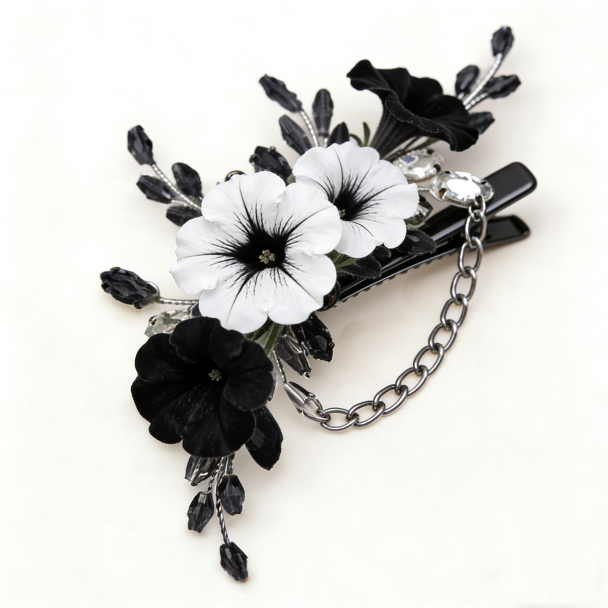 Gothic black-white petunia hair clip with chain detail, cool and unique. Ideal for alternative styles, daily wear, and edgy fashion looks.